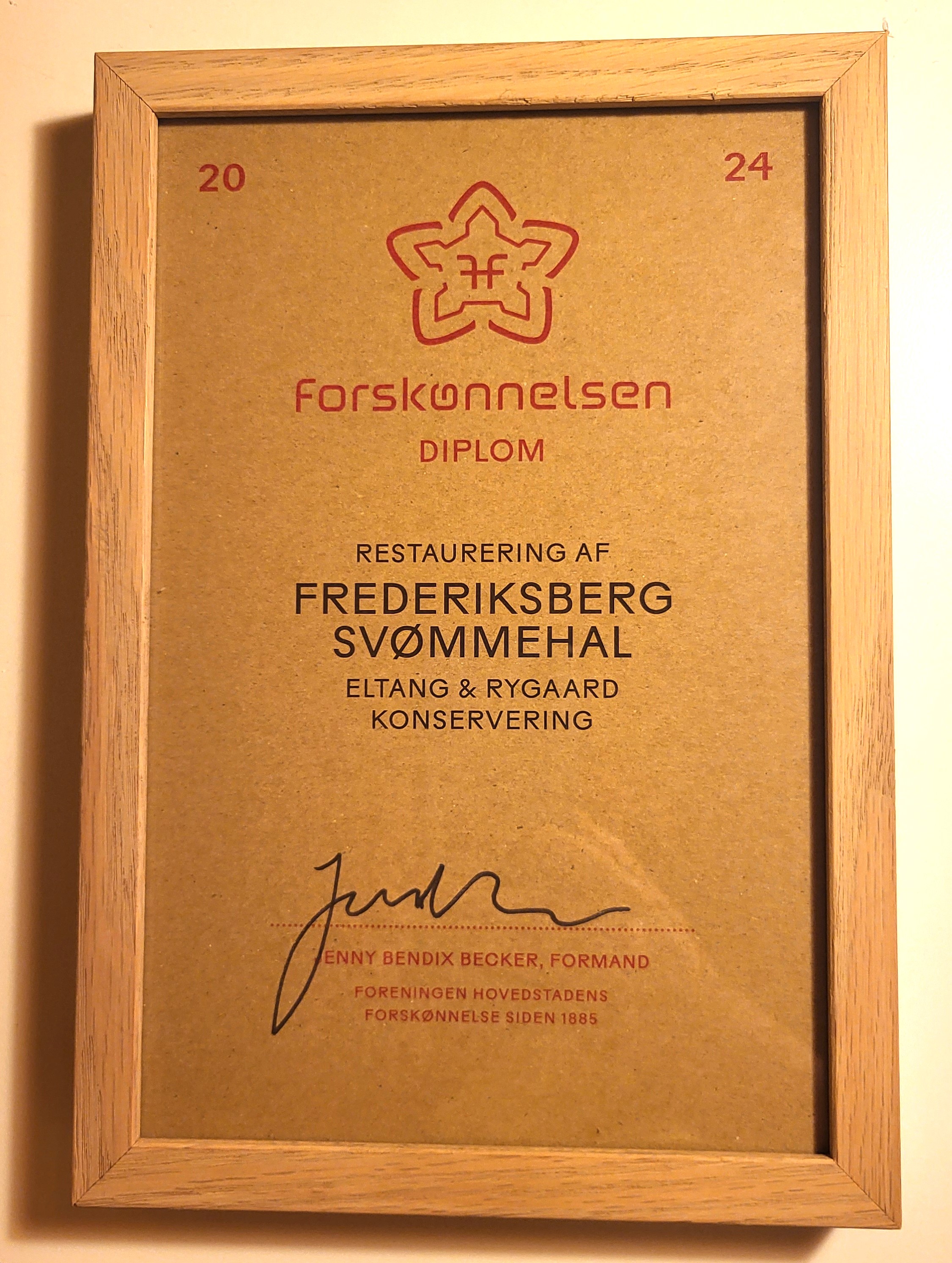 Det nye år begyndte godt for Eltang & Rygaard Konservering, da vi d. 9. januar blev præmieret af Foreningen til Hovedstadens Forskønnelse (FHF) for vores bevarende arbejder på Vilhelm Lundstrøms smukke vægmosaikker i Frederiksberg Svømmehal. FHF, der blev stiftet i 1885 af bl.a. brygger og kunstsamler Carl Jacobsen (1842-1914) og billedhuggeren Vilhelm Bissen (1836-1913), uddeler hvert år plaquetter og diplomer til projekter, som efter bestyrelsens skøn har bidraget til at bevare eller forbedre byens skønhed.