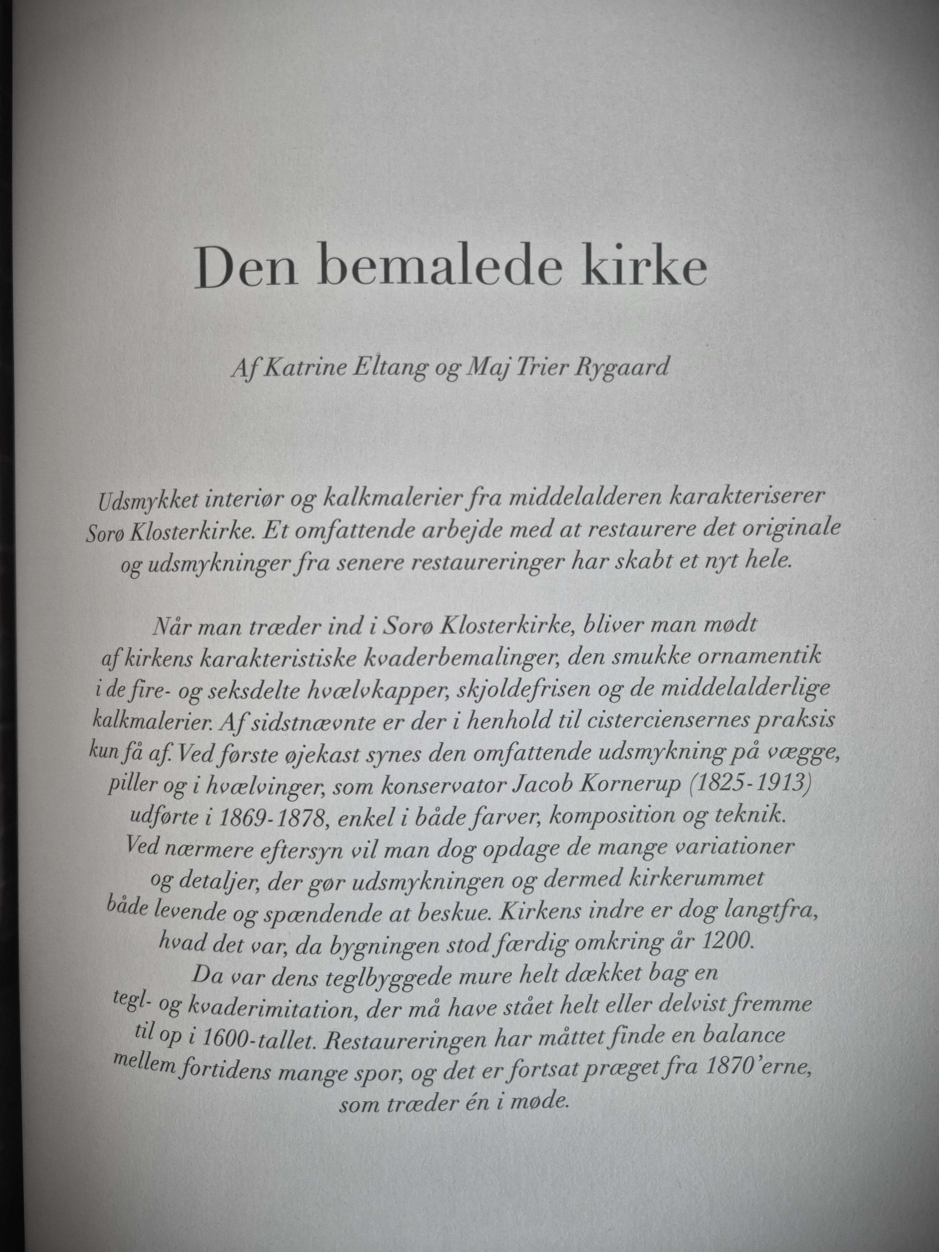 I 2022 blev en omfattende restaurering af Sorø Klosterkirke afsluttet. I bogen Sorø Klosterkirke – Undersøgelse og Restaurering. 2017-2022 beskrives baggrunden for restaureringen og en lang række af de gennemførte undersøgelser og behandlinger gennemgås. Eltang & Rygaard har skrevet tre kapitler til bogen, bl.a. den fælles artikel: Den bemalede kirke, der beskriver restaureringen af kirkens originale middelalderlige udsmykninger samt senere restaureringer. Det er en interessant og ikke mindst smuk bog, der er udgivet ved forlaget Aristo. Bogen blev udgivet d. 1. april 2025 og kan bestemt anbefales!