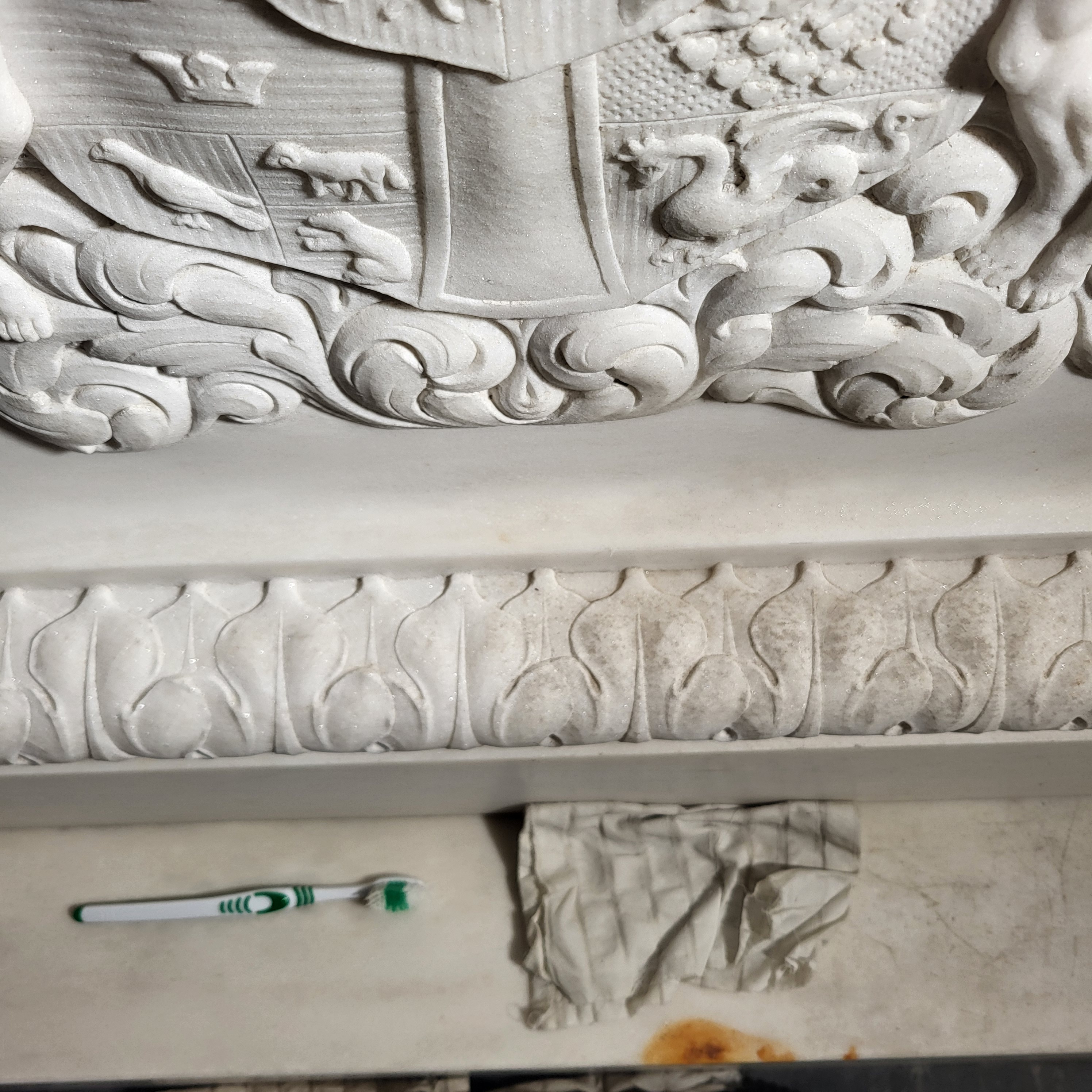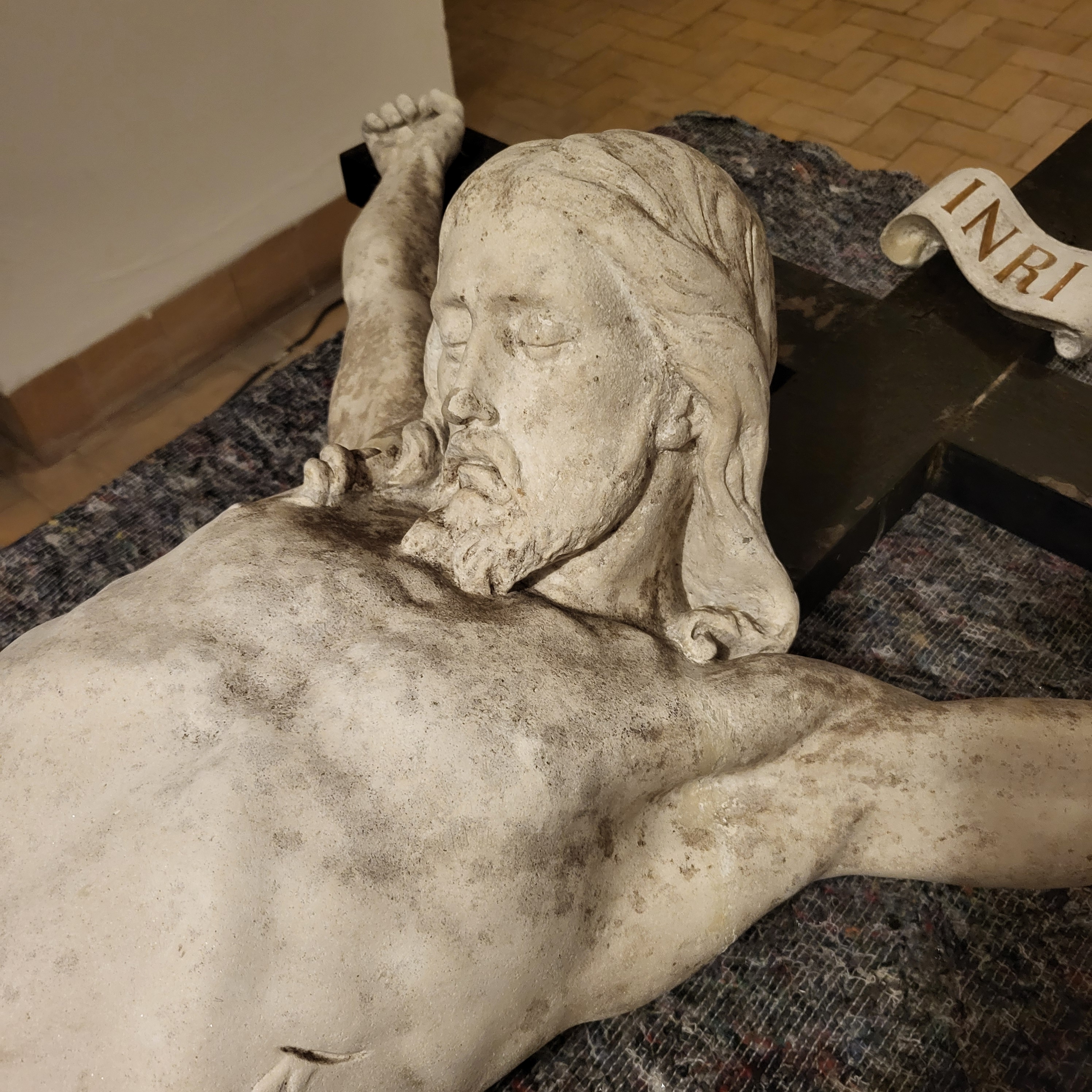 Vores undersøgelser viste, at krucifikset i krypten under Chr. d. 6’s kapel synes støbt i en kunststen, i dette tilfælde en blanding af en hvid matrix tilsat glimmermineraler, så det på afstand ligner hvid marmor. Dette har været en billigere fremstillingsmetode, men det har også sænket værkets samlede vægt, hvilket har været en fordel, da vægten allerede nu er betydelig.